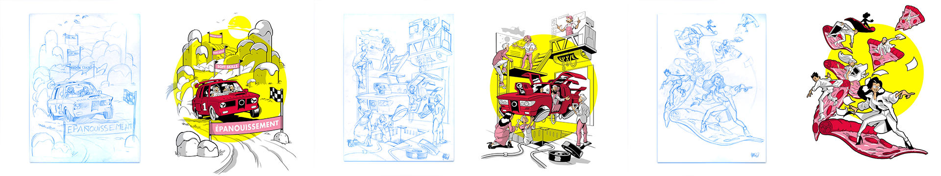 Exemples d’illustrations, de l’esquisse, à la digitalisation et rendu final.